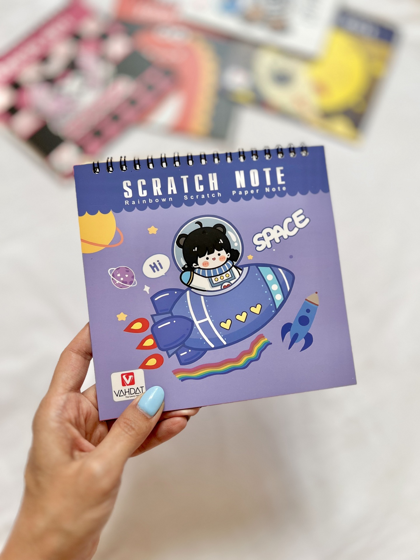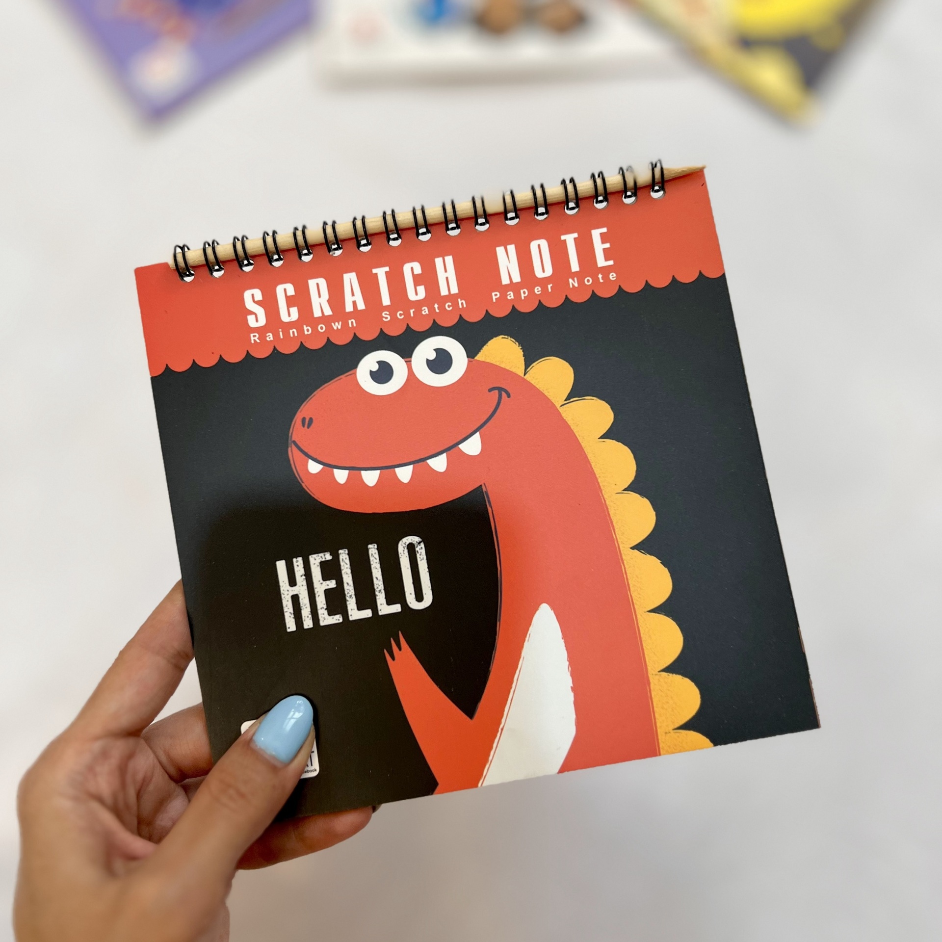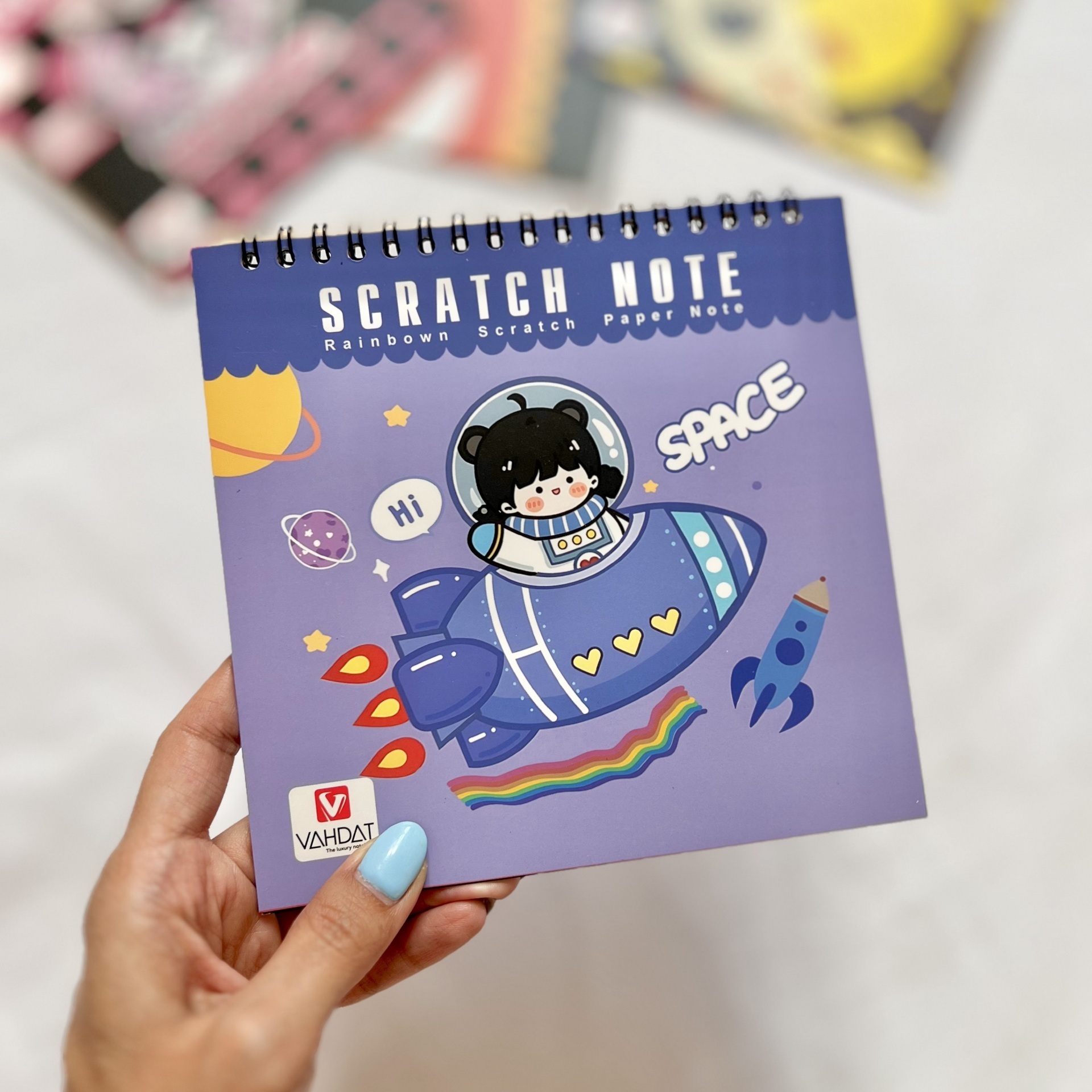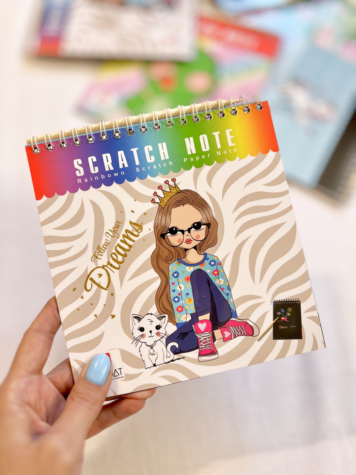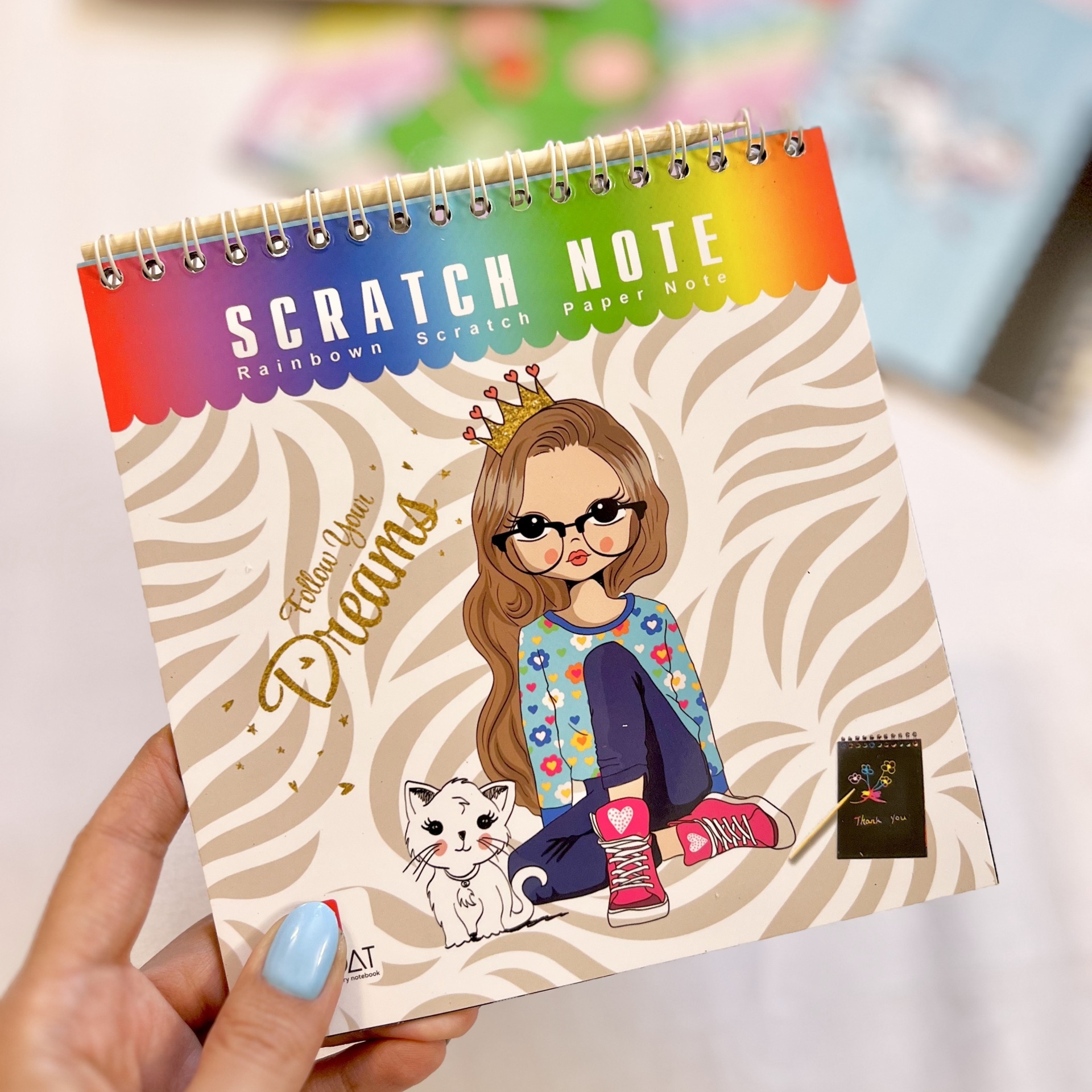 دفتر اسکرچ  یک سرگرمی جذاب و البته خلاقانه را مهمان خانه‌های شما می‌کند. این دفتر جادویی رنگین کمانی به همراه یک مداد چوبی عرضه می‌شود و پیشنهاد خوبی برای کشیدن نقاشی‌های کم هزینه و جذاب است. نحوه کار با این محصول جالب بدین صورت است که با استفاده از مداد چوبی مخصوص، صفحات مشکی دفتر را به دلخواه خود خراش می‌دهید و تصاویری ایجاد می کنید که به صورت رنگین کمانی بر روی این صفحات مشکی نمایان می شود.
