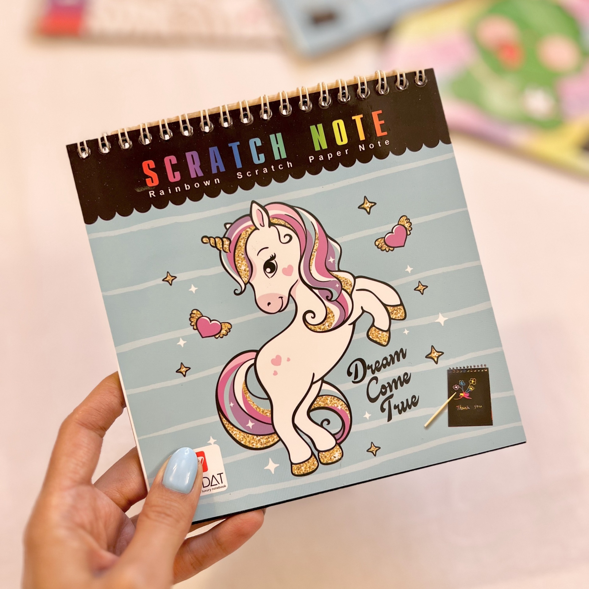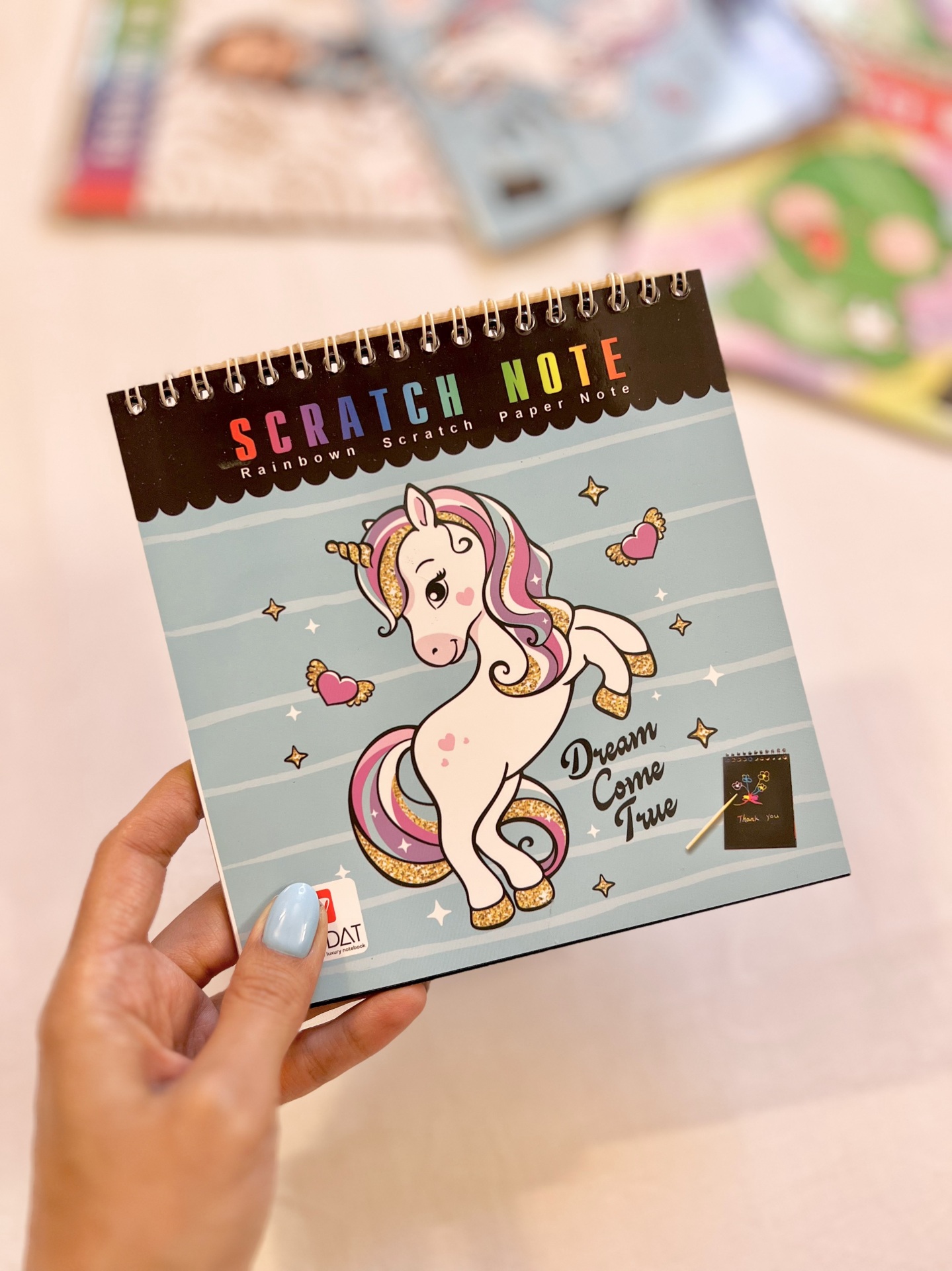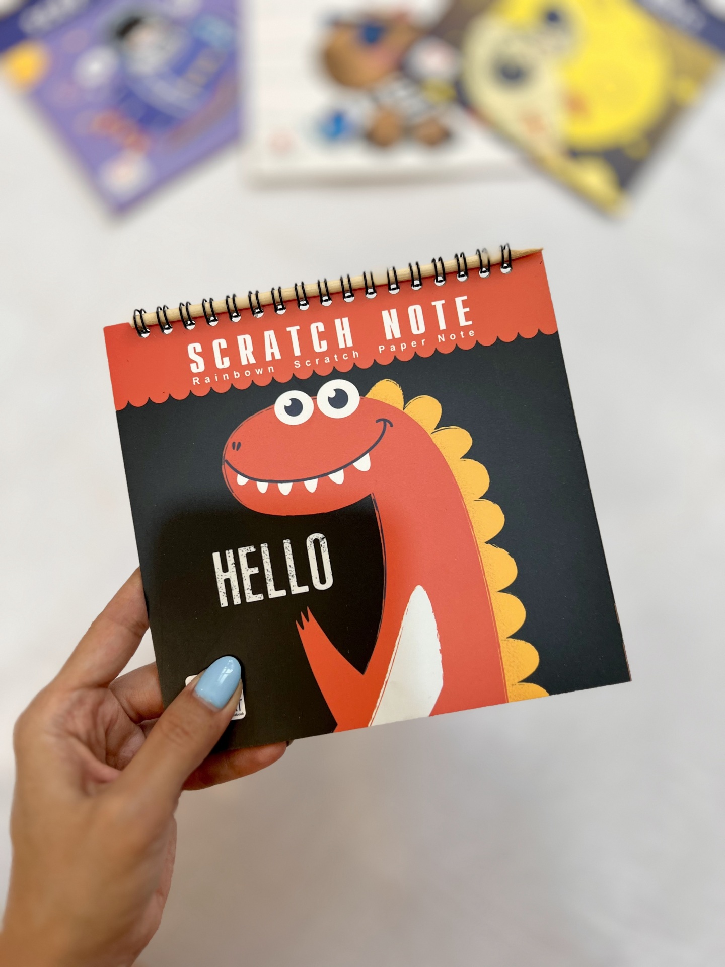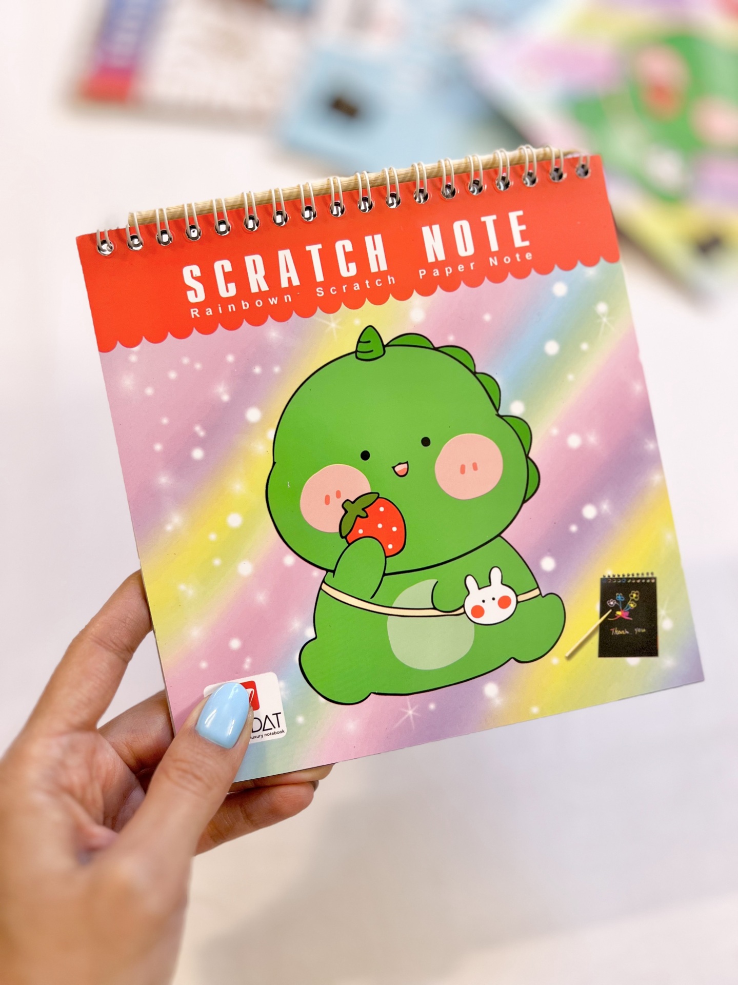 دفتر اسکرچ  یک سرگرمی جذاب و البته خلاقانه را مهمان خانه‌های شما می‌کند. این دفتر جادویی رنگین کمانی به همراه یک مداد چوبی عرضه می‌شود و پیشنهاد خوبی برای کشیدن نقاشی‌های کم هزینه و جذاب است. نحوه کار با این محصول جالب بدین صورت است که با استفاده از مداد چوبی مخصوص، صفحات مشکی دفتر را به دلخواه خود خراش می‌دهید و تصاویری ایجاد می کنید که به صورت رنگین کمانی بر روی این صفحات مشکی نمایان می شود.
