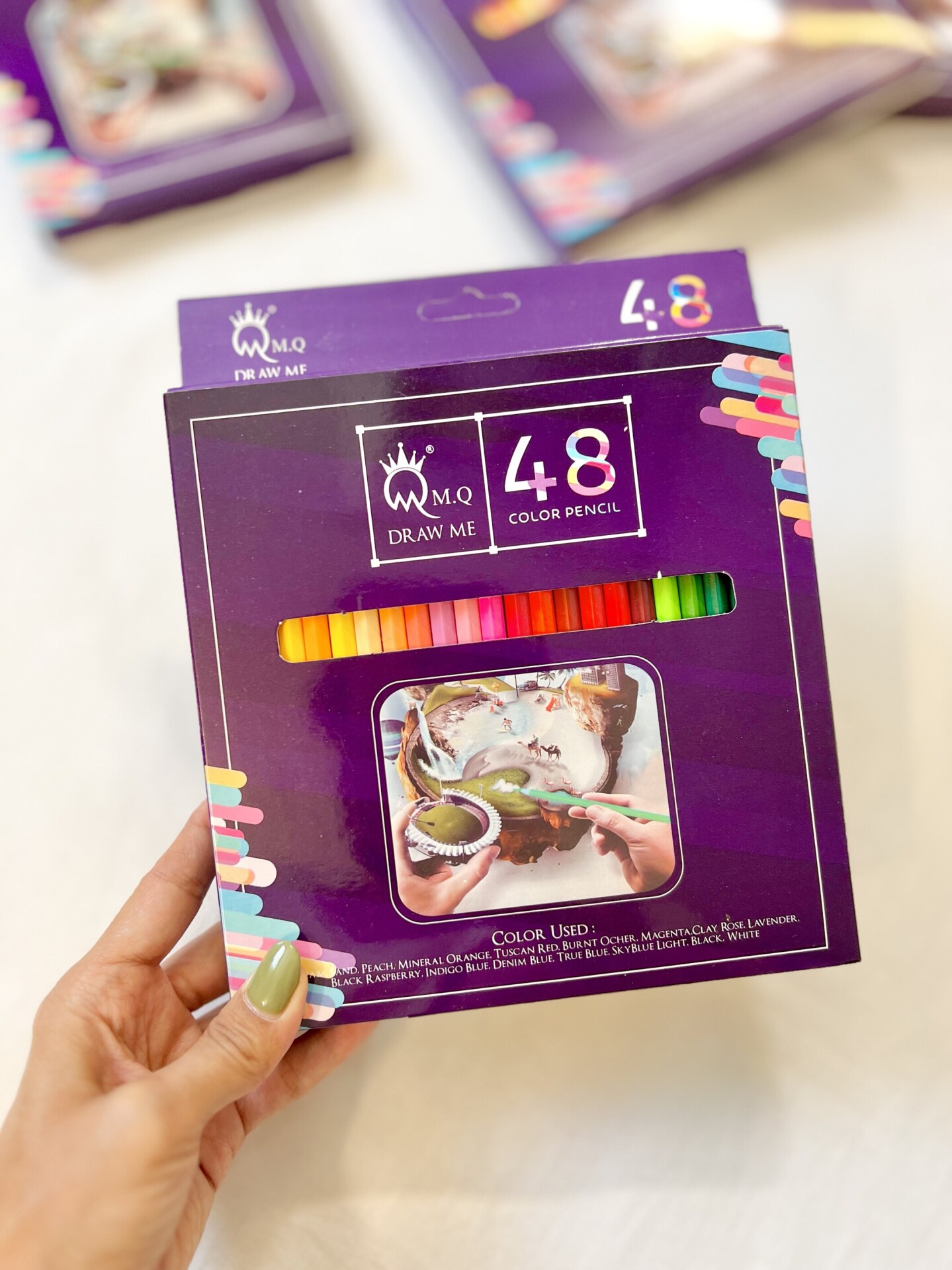M.Q برندی است که در زمینه تولید محصولات و ملزومات هنری و انواع مداد رنگی فعالیت دارد، مدادرنگیهای M.Q بسیار خوشساخت هستند و در مدلهای مختلف از جمله سری رنگ پوست تیره، سری رنگ پوست روشن، سری شیشه و .. تولید میشوند. مدل 48 رنگ یکی از محصولات لوکس M.Q است که به دلیل کیفیت اثباتشده و مثال زدنیاش، مورد استفاده و علاقهی هنرمندان قرار گرفته است. مواد با کیفیت، تکنولوژی مدرن و رنگهای متنوع، در هم آمیخته و منجر به تولید مدادهایی ایدهآل با نوک بسیار مقاوم در برابر شکستن و در عین حال نرم شده است. مقاومت در برابر نور و عدم کمرنگ شدن، خاصیت ضد آب با رنگهایی بسیار زنده، شفاف و دائمی، که روی کاغذ پخش نمیشوند از سایر ویژگیهای مداد رنگی M.Q است. رنگ پایه روغنی این مدادها را میتوان برای ایجاد افکتهای لایهای و سایه روشن، بهراحتی با هم ترکیب کرد. یکی دیگر از ویژگیهای مهم مدادهای M.Q قابلیت ترکیب رنگهای آن با سایر رنگها از جمله مدادهای مومی است. ترسیم الگوهای شیشهای با وضوح وشفافیت فوقالعاده و ایجاد حالت براق و منعکس کننده از ویژگیهای بارز و منحصربفرد این مدل است. M.Q شهرت خود را مدیون بافت نرم و شفافی است که نوک آن روی کاغذ ایجاد میکند. این نوک حالت پاستلی روغنی دارد تا هنرمند علاوه بر ایجاد بافت، از پس اجرای تکنیکهایی از جمله هاشور زدن و محو کردن هم بهخوبی بربیاید. بدنهی مدادهای M.Q بصورت ارگونومیک طراحی شده که مانع از خستگی انگشتان دست هنگام نقاشی میشود. تمامی این ویژگیها ارمغان یک محصول خارق العاده را به شما میدهد.